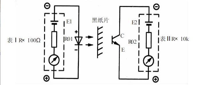 采用“雙表法”檢查光電開關(guān)的電路如圖2 所示。為避免外界光線的影響,應(yīng)盡量在暗處檢測光電開關(guān)。具體方法是:將表Ⅰ撥至R×100 Ω 檔向發(fā)射管提供正向電壓,表Ⅱ置于R×10 kΩ 檔測量c-e 極間電阻。把黑紙片放在發(fā)射窗與接收窗中間,用來阻擋紅外線。上、下抽動紙片時應(yīng)觀察到表Ⅱ指針有明顯的擺動。在測試條件不變的情況下,指針擺幅愈大,說明器件的靈敏度愈高。