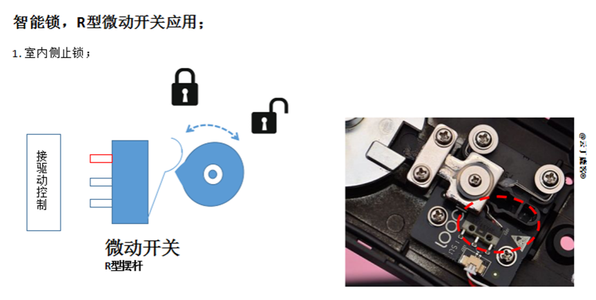 而微動開關(guān)在智能鎖中的作用不容小覷,它在智能鎖中主要用來檢測鎖舌的位置,告知目前門鎖的狀態(tài)——是開鎖狀態(tài)還是關(guān)鎖狀態(tài),從而向電機發(fā)送驅(qū)動信號,推動或拉回鎖桿。對于智能鎖而言,微動開關(guān)是至關(guān)重要的存在,若微動開關(guān)失效,那么整個鎖體將失靈,住戶安全將得不到保障。微動開關(guān)通常又分為直擺桿型和R型擺桿兩種類型。