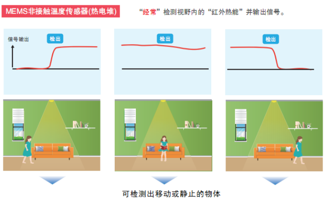 歐姆龍自主研發(fā)的D6T系列非接觸溫度傳感器, 采用獨(dú)創(chuàng)的MEMS技術(shù),將熱電堆元件和ASIC封裝在一起,實(shí)現(xiàn)了精度高,體積小,便于嵌入多種電子產(chǎn)品等特點(diǎn)。與熱釋電型紅外傳感器相比, 歐姆龍D6T系列非接觸傳感器不僅可以檢測(cè)動(dòng)態(tài)物體,也可檢測(cè)靜止物體。通過(guò)物體表面細(xì)微的溫度差和溫度變化進(jìn)行檢測(cè), 不僅適用于家電節(jié)能、安防設(shè)備、樓宇建筑等領(lǐng)域,也適用于護(hù)理看護(hù)類的應(yīng)用場(chǎng)景。
