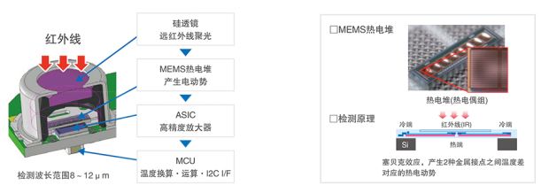 MEMS非接觸溫度傳感器(紅外傳感器)是由熱電堆元件接收來自對(duì)象物的紅外熱能,從而以非接觸方式檢測(cè)對(duì)象物表面溫度的傳感器。