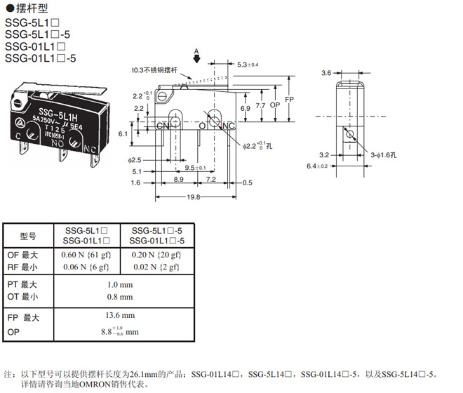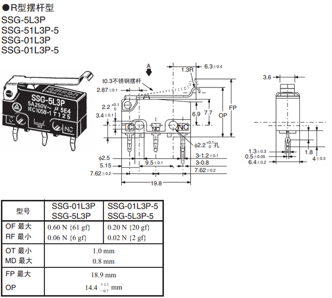 | R型擺桿型 | 焊接端子 | 0.60 N {61 gf} | SSG-5L3H | SSG-01L3H |