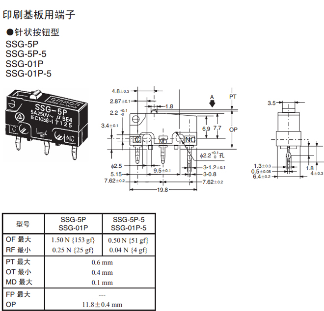 | 焊接端子 | 0.20 N {20 gf | SSG-5L1H-5 | SSG-01L1H-5 | |