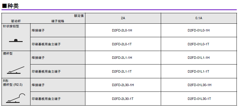 D2FD-2 超級小型基本開關 兼具防塵功能的極超小型基本開關 利用橡膠封裝的密封結構實現防塵 (IEC IP6X)。可在有灰塵、紙粉的環境下使用。 可動片為1片彈簧構造,支持AC125V 2A開關,更有微小負載型可供選擇。 還備有焊接、印刷基板用端子。