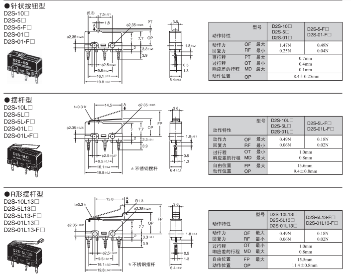 具有較好的耐焊劑性的超小型系列 焊劑無法進入的一體成型端子結構。 動作位置(OP)的精度高達±0.25mm,周邊設計和定位簡單。 采用了橫向操作中也能方便動作的針狀按鈕型。