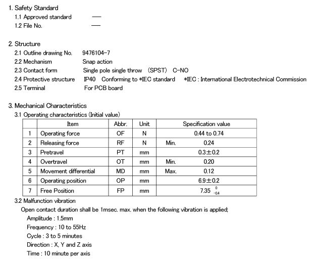 D2FC-F-7N(10M), 克力為:60+/-15G,壽命為1000萬次;