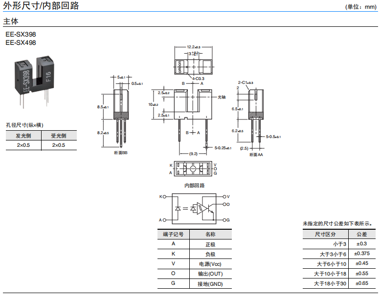 凹槽端子型(槽寬:3mm) ? 光電IC輸出(分為遮光時ON(EE-SX398)/入光時ON(EE-SX498) 2種類型) ? 適用電源電壓為DC4.5~16V ? 可直接連接C-MOS