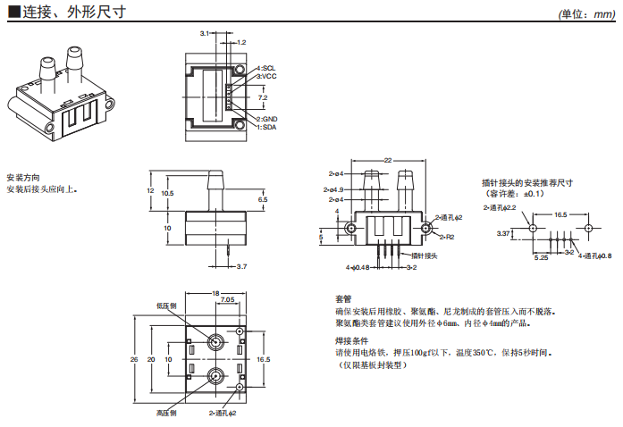 測量范圍:±500Pa 小型、高精度、耐環境性能卓越的差壓傳感器 ±3%RD的高精度。 具備直線補償、溫度補償功能。 數字輸出(I2C通信)。 高流量阻抗減少旁路配置的影響